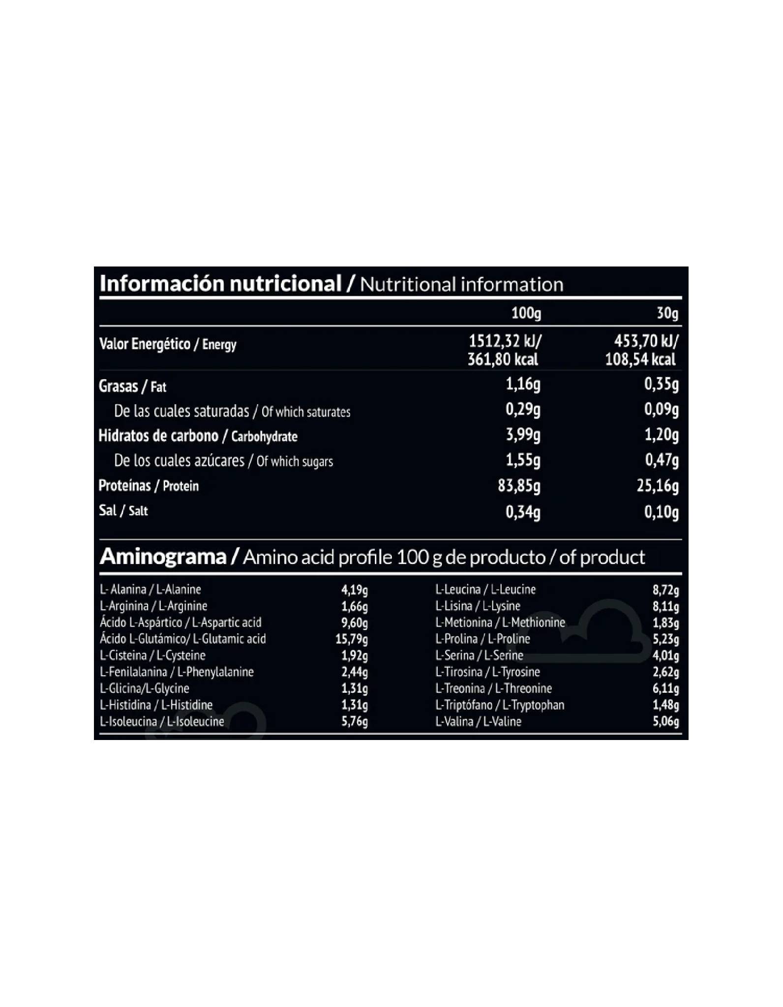 Aislado de proteína de suero de leche 90%, aroma natural de fresa, estevia y cúrcuma.