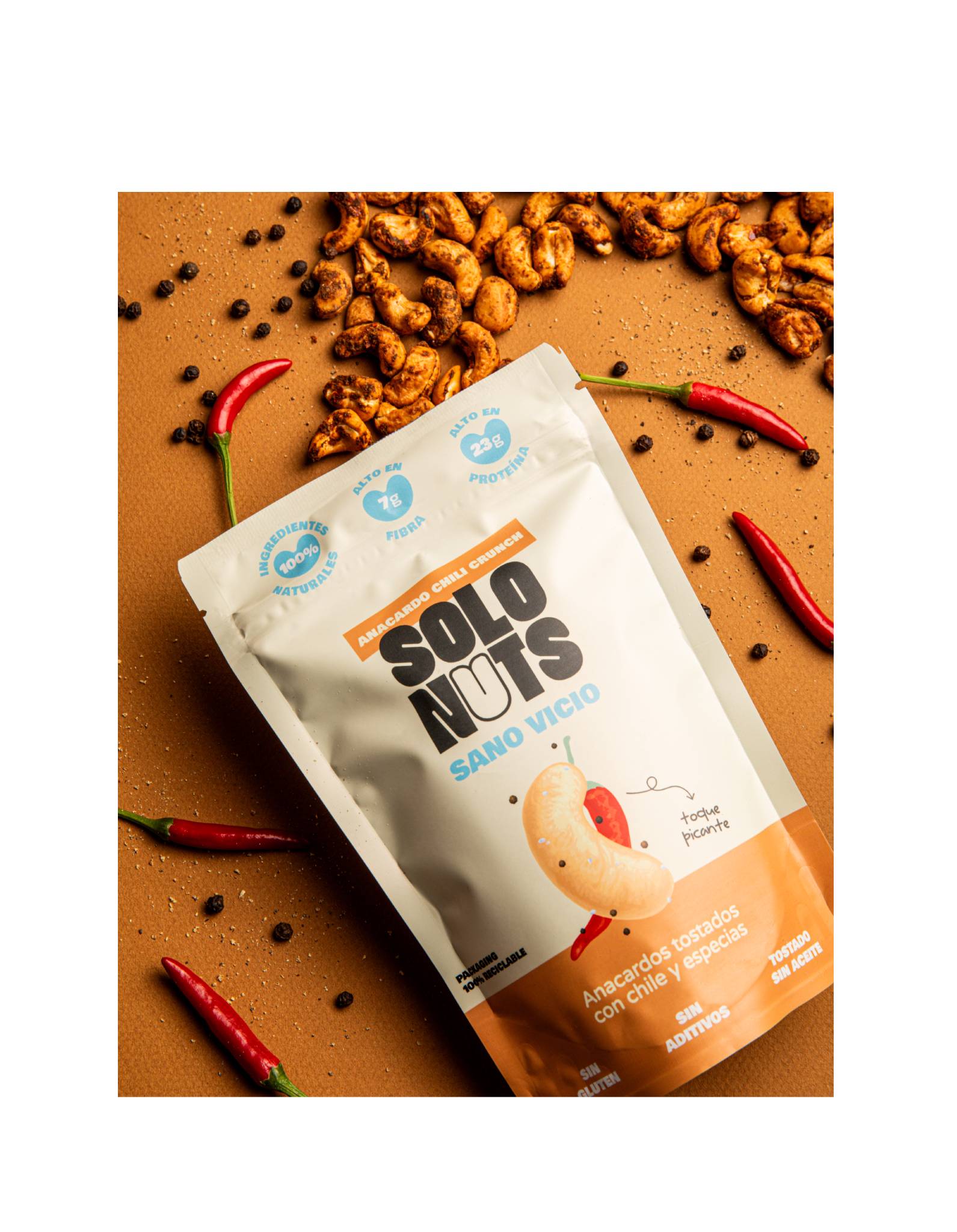 Ingredientes: Anacardo tostado (98%), chile en polvo, pimentón ahumado, pimienta negra, maiz en polvo y sal.