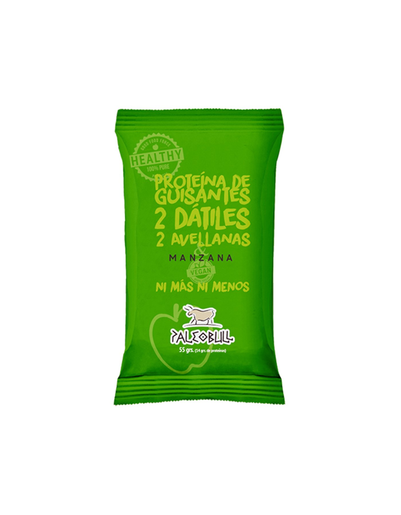 Barrita energética paleo de manzana y proteína de guisantes con 14 gramos de proteínas.