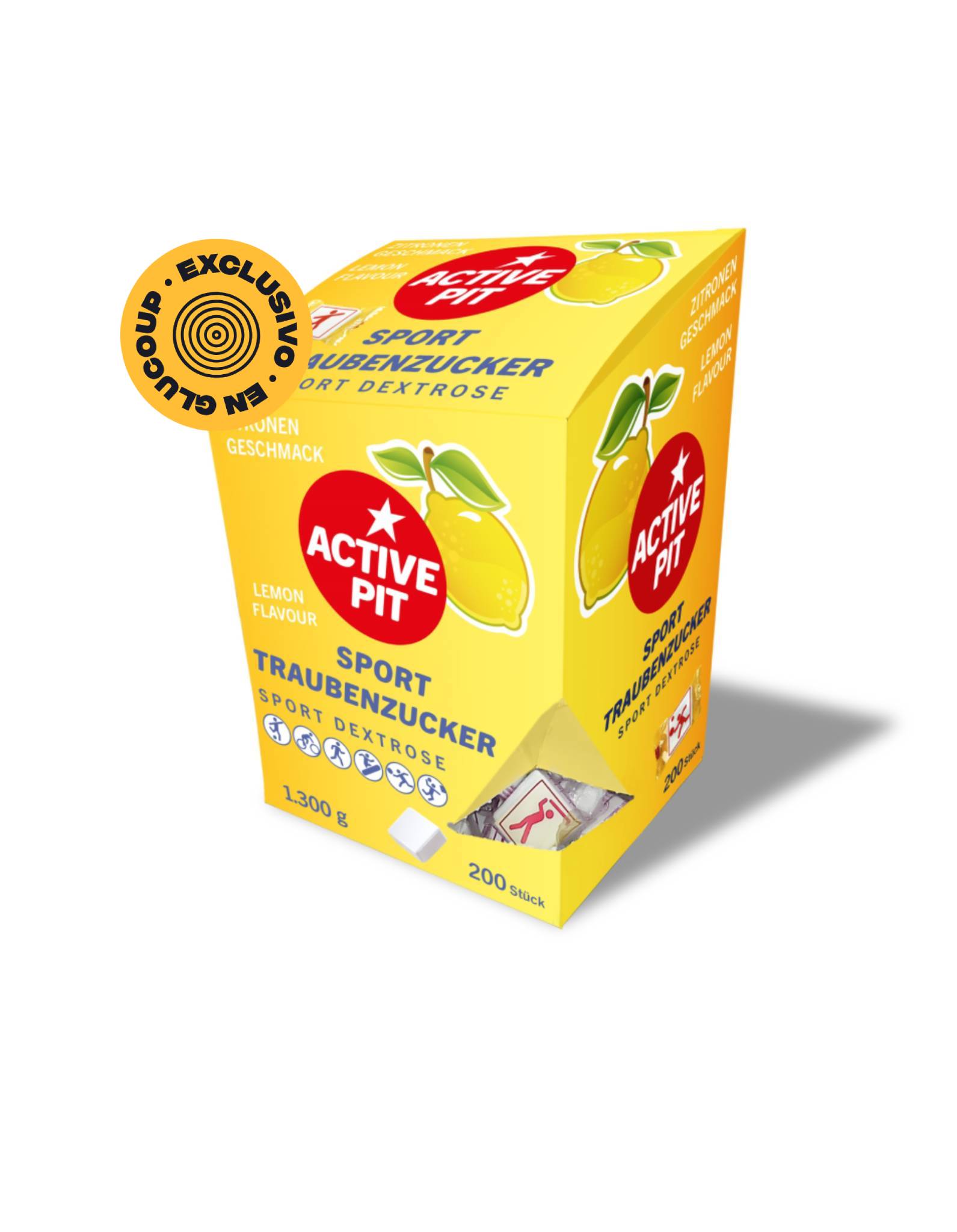 Box de tabletas Active PIT, con 200 pastillas de glucosa/dextrosa masticables, envueltas individualmente para poder llevar siempre un puñado contigo.