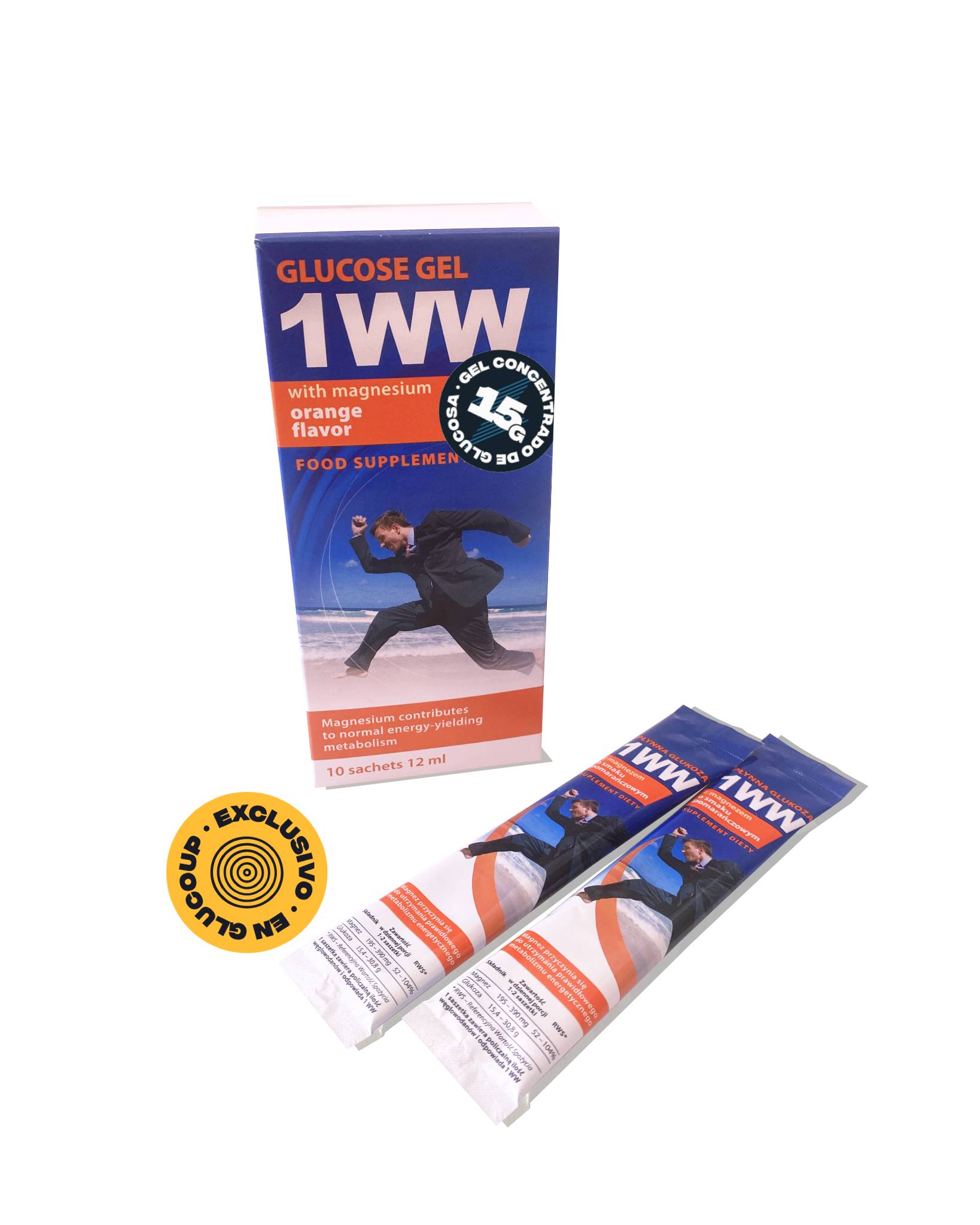 Caja con 10 sobres de gel concentrado de glucosa/dextrosa con magnesio. Cada sobre contiene 15,4g de glucosa de acción rápida.