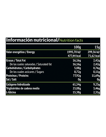 Bote con 450g, con Colágeno y aceite TCM (triglicéridos de cadena media), en polvo.