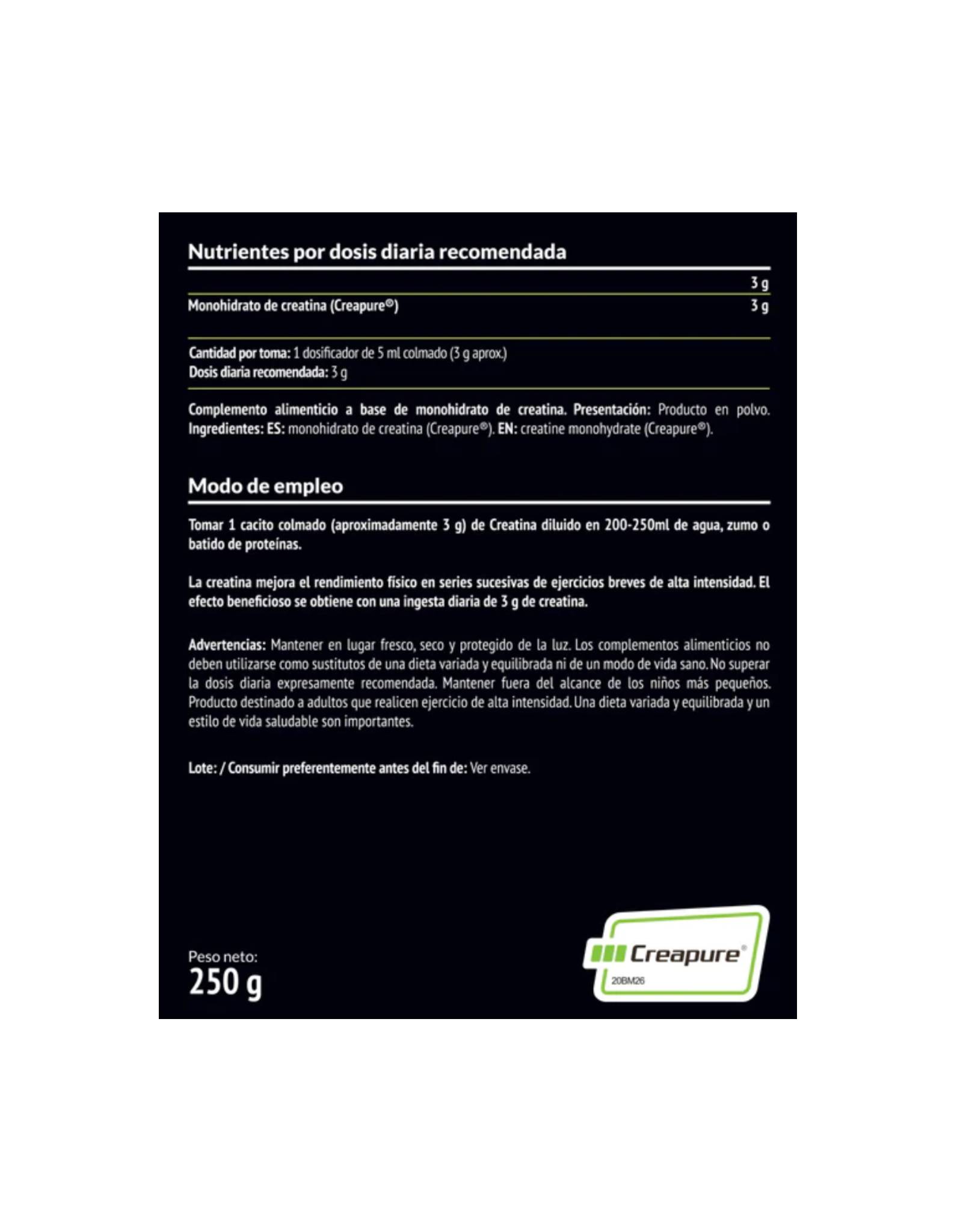 Bote con 250g, con Creatina Creapure ® , en polvo.