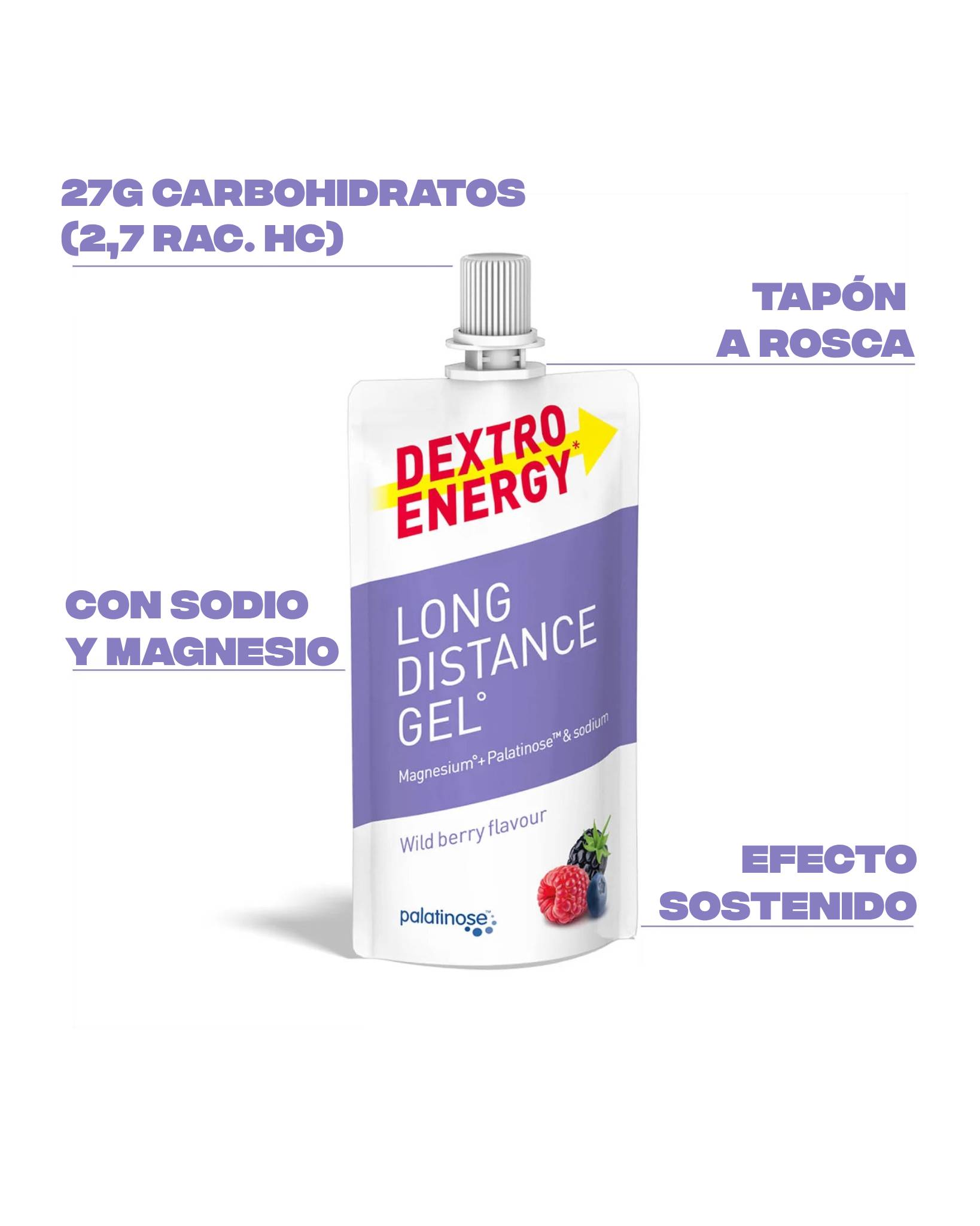 Long Distance Gel (efecto sostenido) es una solución para deportes con una duración de más de 90 minutos. Te proporciona la mezcla especial de dextrosa, maltodextrina e isomaltulosa, conocida bajo la marca Palatinose™ .