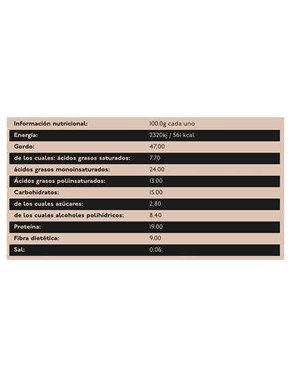 Avellanas, almendras, cacahuetes, semillas de calabaza, edulcorante (xilitol), anacardos, cacao en polvo, semillas de girasol, hojuelas de coco.