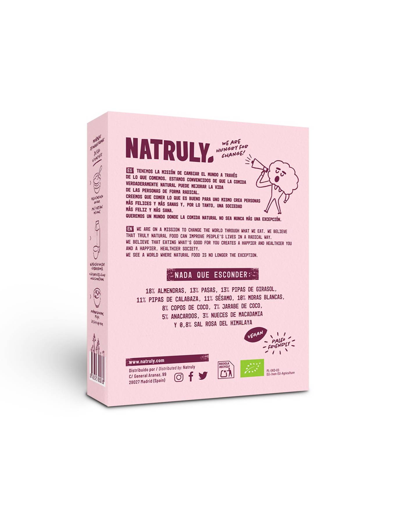 Almendras (18%), pipas de girasol (13%), pasas (13%), sésamo (11%) pipas de calabaza (11%), moras blancas (10%), copos de coco (8%), jarabe de coco (7%), anacardos (5%), nueces de macadamia (3%), sal rosa del Himalaya (0.8%) *Procedente de agricultura ecológica.