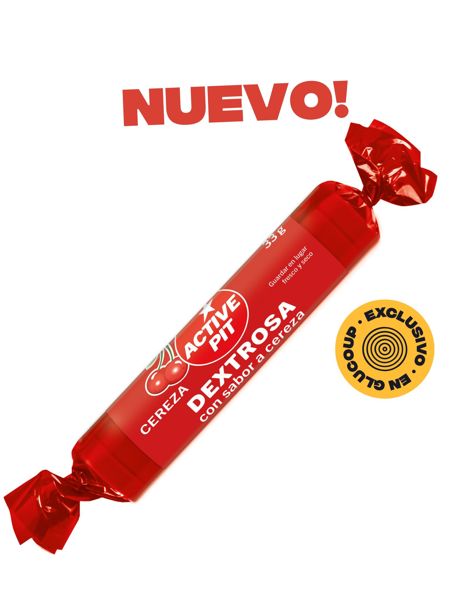 Dextrosa, agua cristalizada (96 %), acidulante (ácido cítrico), polvo de cereza (0,6 %), aroma natural, aceite de coco, antiaglomerante (sales magnésicas de ácidos grasos).